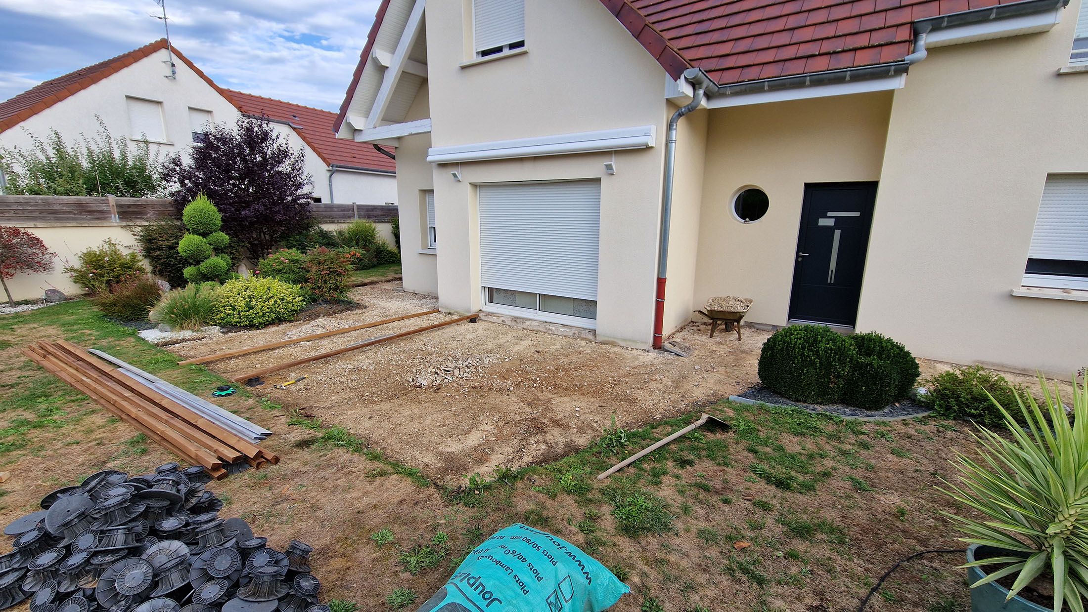 Posée sur plot et lambourde en ose traditionnel et lame de frise périphérique pour mieux dessiner la terrasse