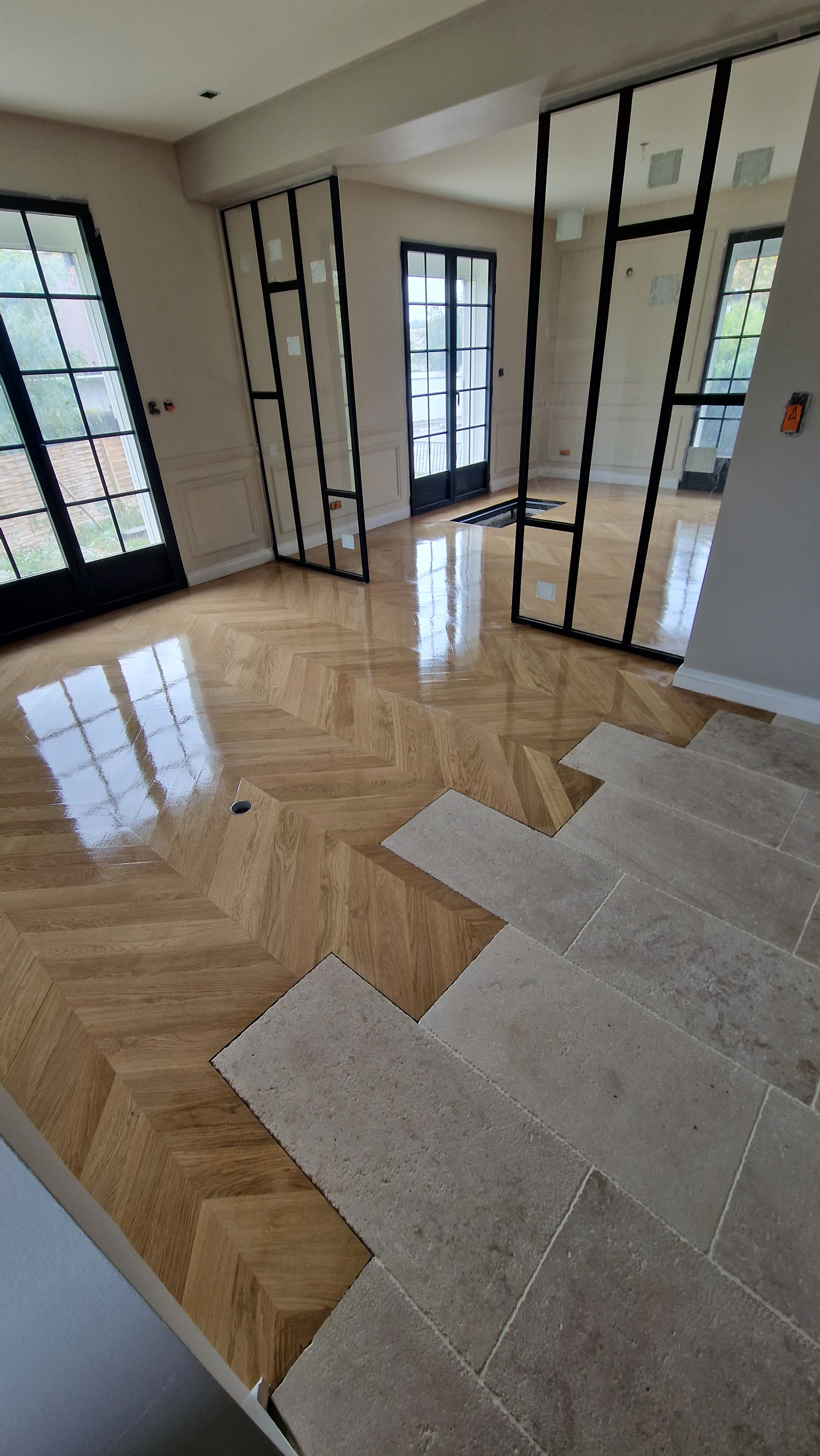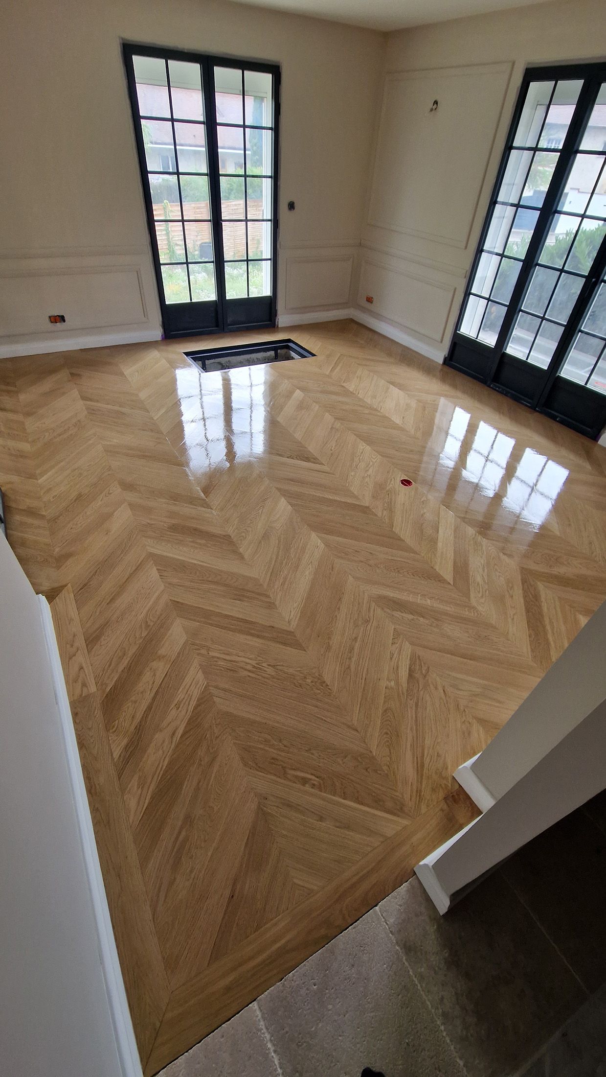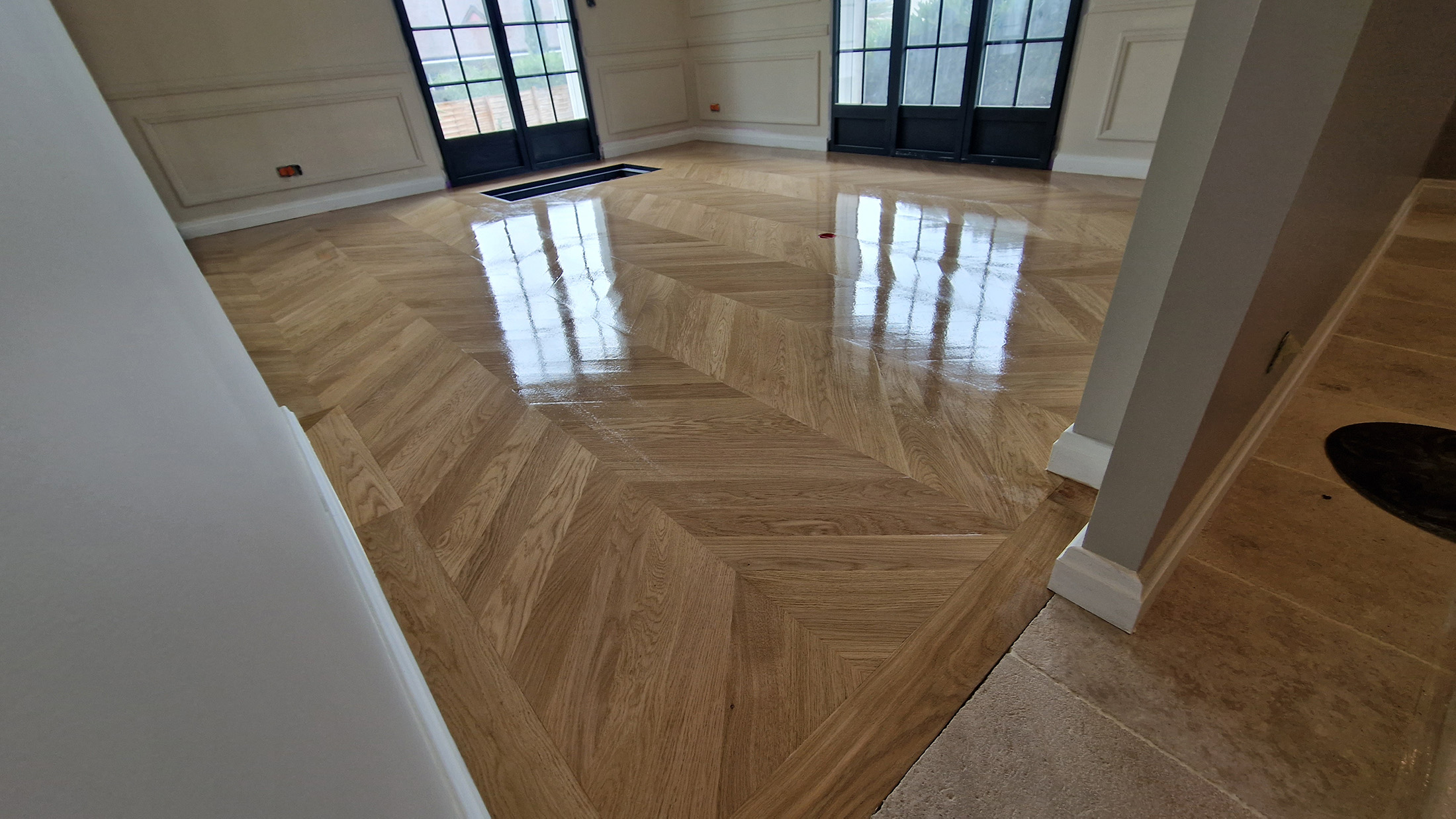 Ponçage et vitrification incolor intensive blanchon sur un parquet point de Hongrie