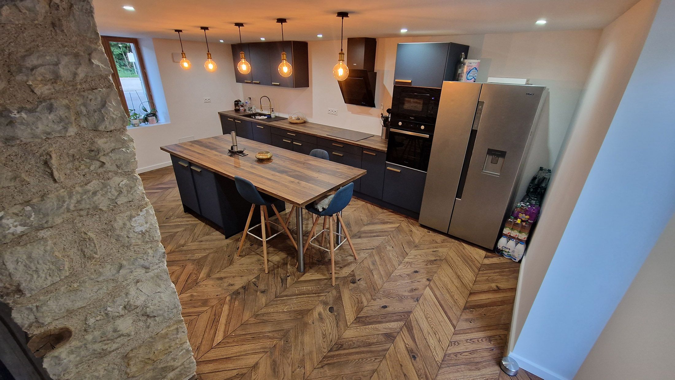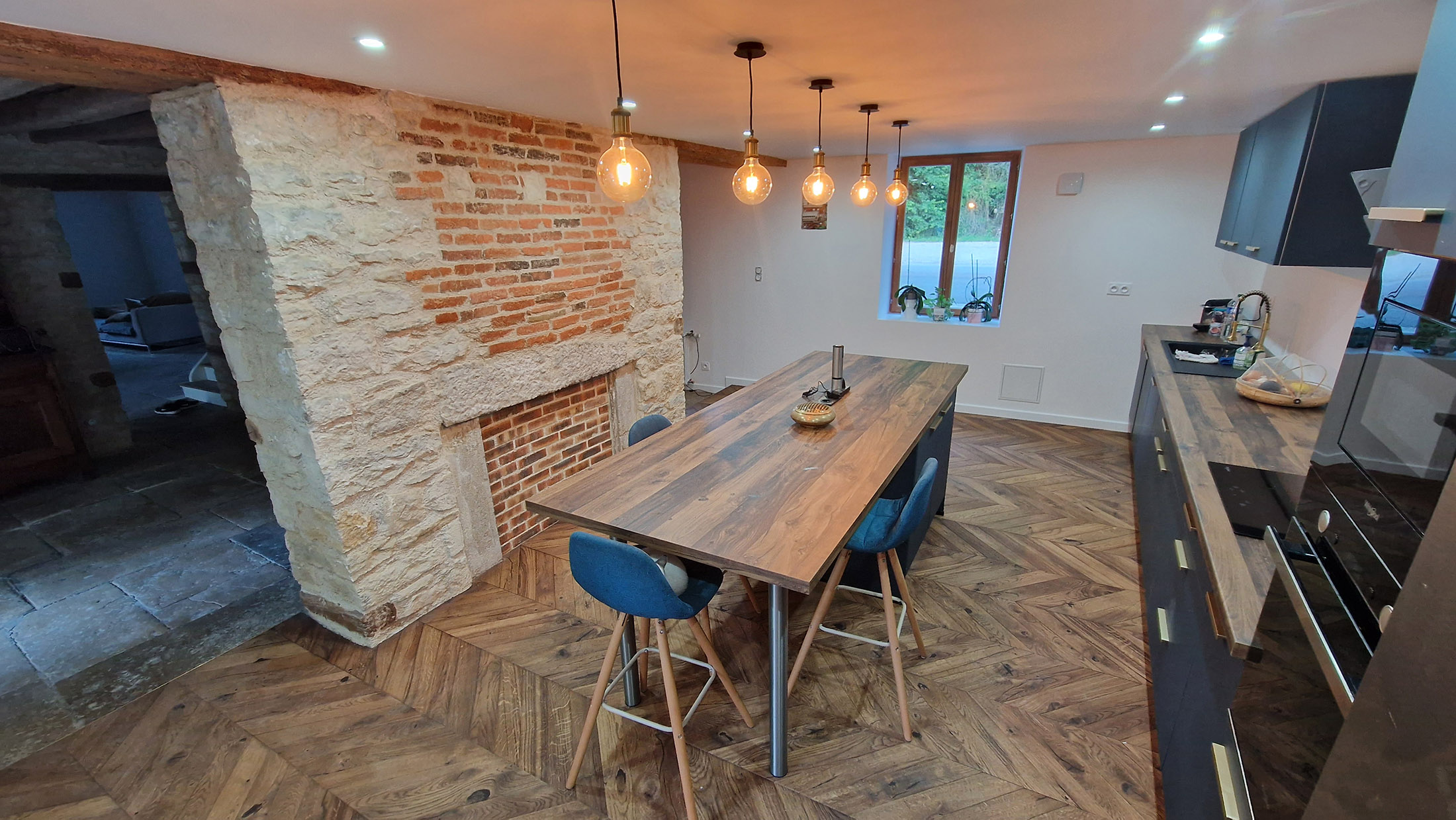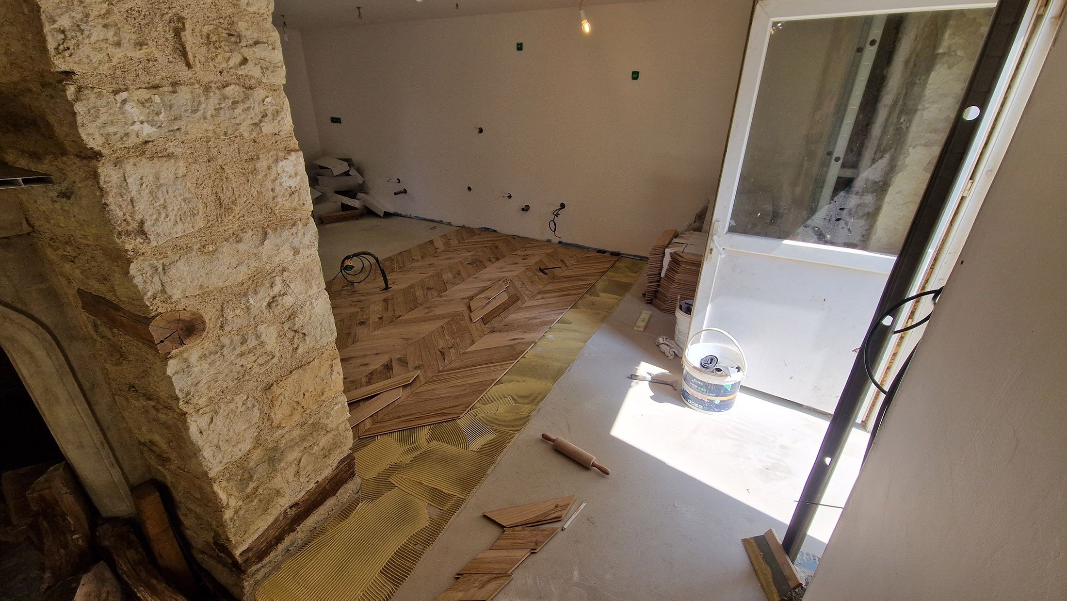 - ponçage et application d'une solidoil vieux chêne blanchon pour obtenir un résultat atypique d'un vieux parquet comme à l'époque